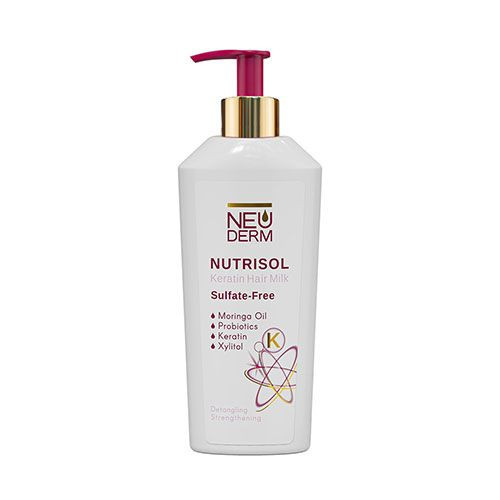 شیر مو کراتین فری سولفات نئودرم نوتریسل برای موهای رنگ شده، وز و خشک بسیار مناسب است؛ کراتین موجود در این محصول، با تقویت و ترمیم مو مانع از شکستگی، خرد شدن و وزی ساقهها خواهد شد. روغن مورینگا نیز سرشار از مواد معدنی بوده و باعث افزایش تولید کراتین و رطوبت مو میشود.