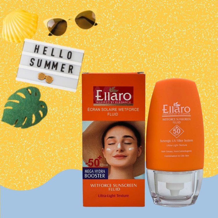 فلوئید ضد آفتاب وت فورس الارو 50 میل با بافت سبک و جذب بسیار سریعی که دارد، هیچ احساس سنگینی و چربی ناخوشایندی را به پوست صورت شما نمیدهد. ضد افتاب فلوئید الارو وت فورس (wetforce) مانند همه کرمهای ضد آفتاب، حاوی فیلترهای محافظت از اشعههای مضر UV است.فرمولاسیون فلوئید ضد آفتاب وت فورس دارای SPF 50 حجم 50 میل الارو به گونهای بوده که برای استفاده پوستهای چرب و مختلط بهترین گزینه است.